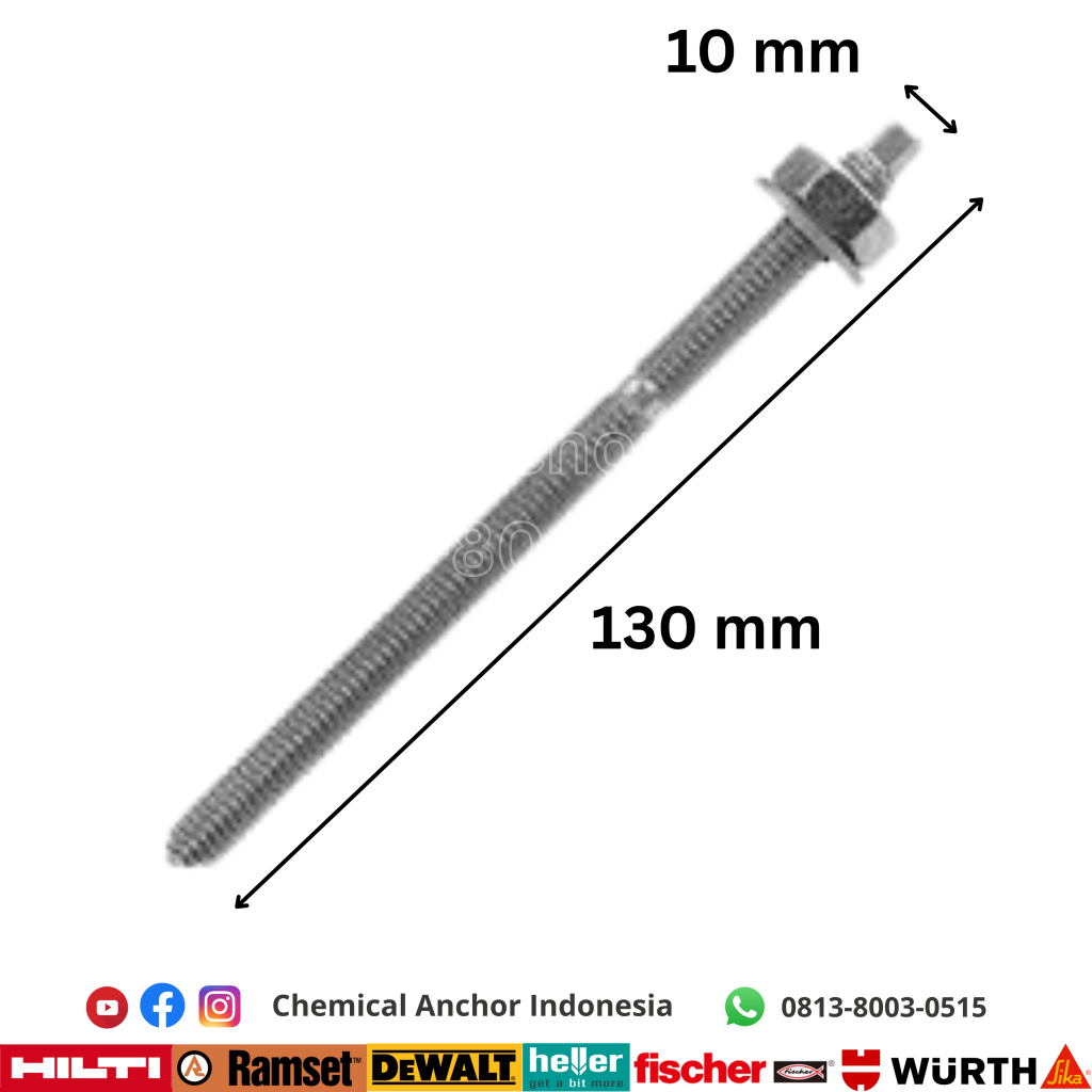 Secara spesifik, chemical anchor M10 memiliki panjang anchor standar sebesar 130 mm. Ukuran ini dirancang untuk memberikan keseimbangan antara kekuatan dan efisiensi pemasangan. Dengan ukuran anchor M10 x 130 mm, pengguna dapat memastikan bahwa pemasangan tetap kuat tanpa harus menggunakan dimensi yang terlalu besar atau boros material. Hal ini juga berdampak pada efisiensi biaya dan kemudahan instalasi di lapangan.